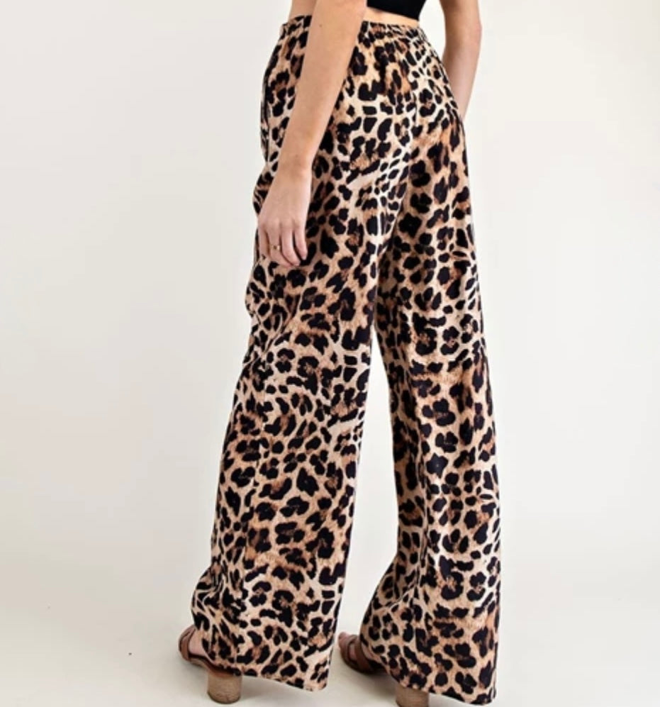 Cheetah and tinted pants featuring a ln elastic waist and drawstring cinch closure, two side hip pockets, in a straight leg design and flowy fabrication.